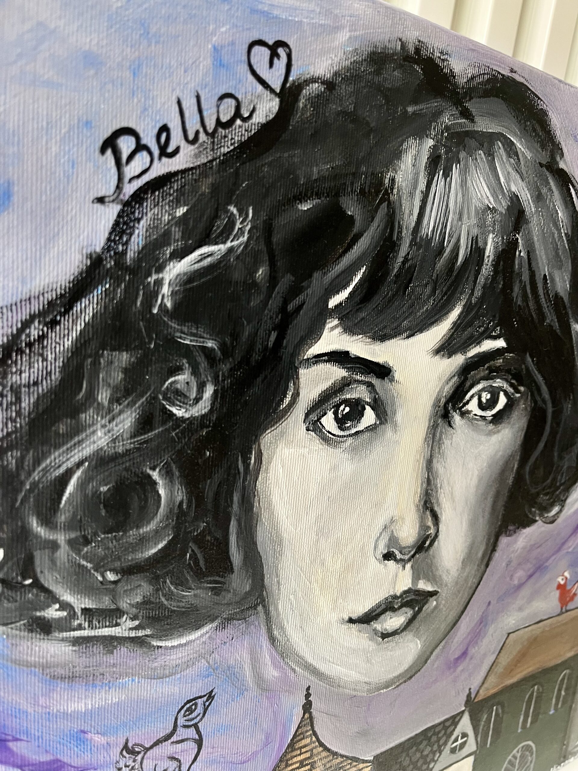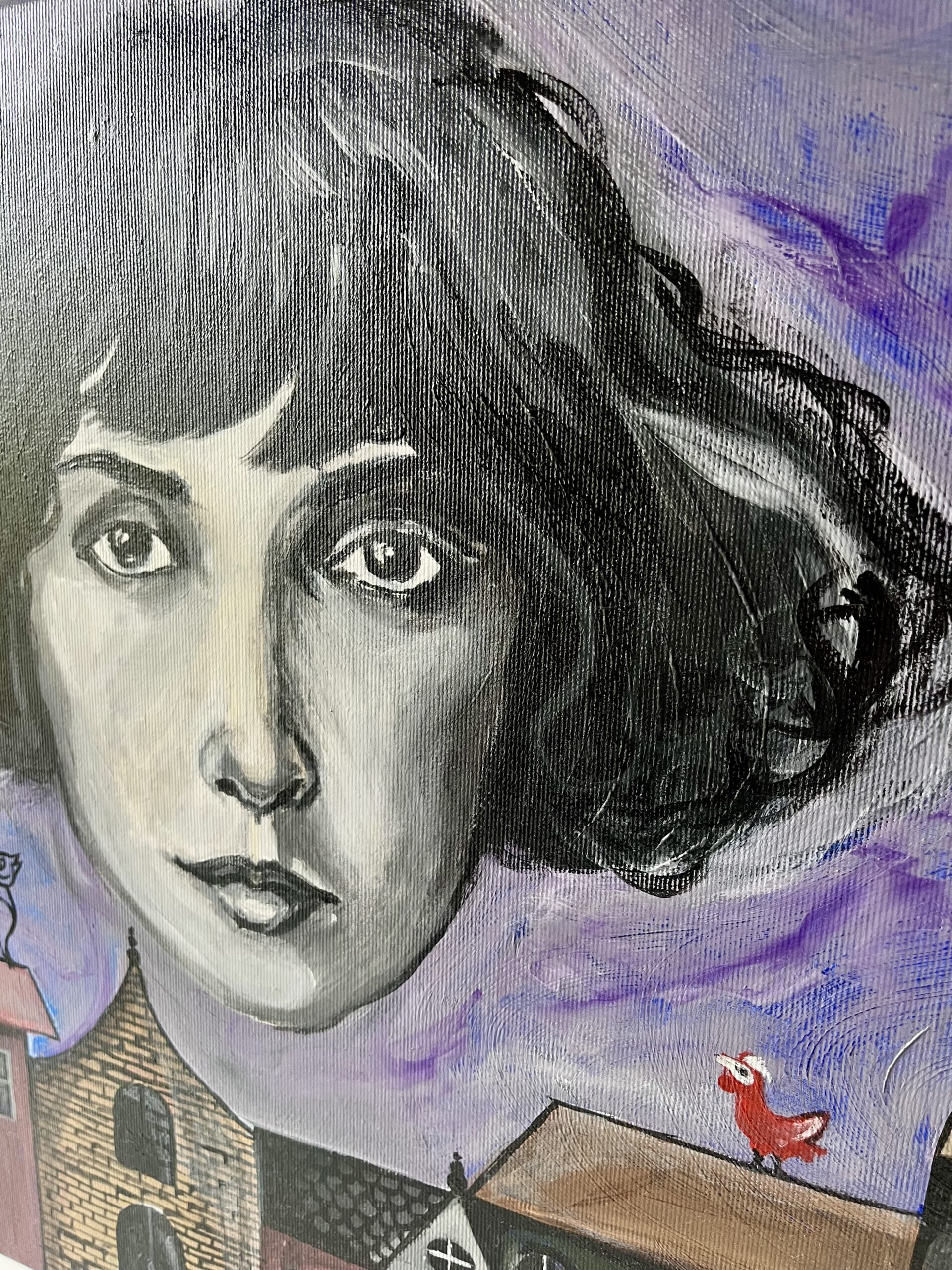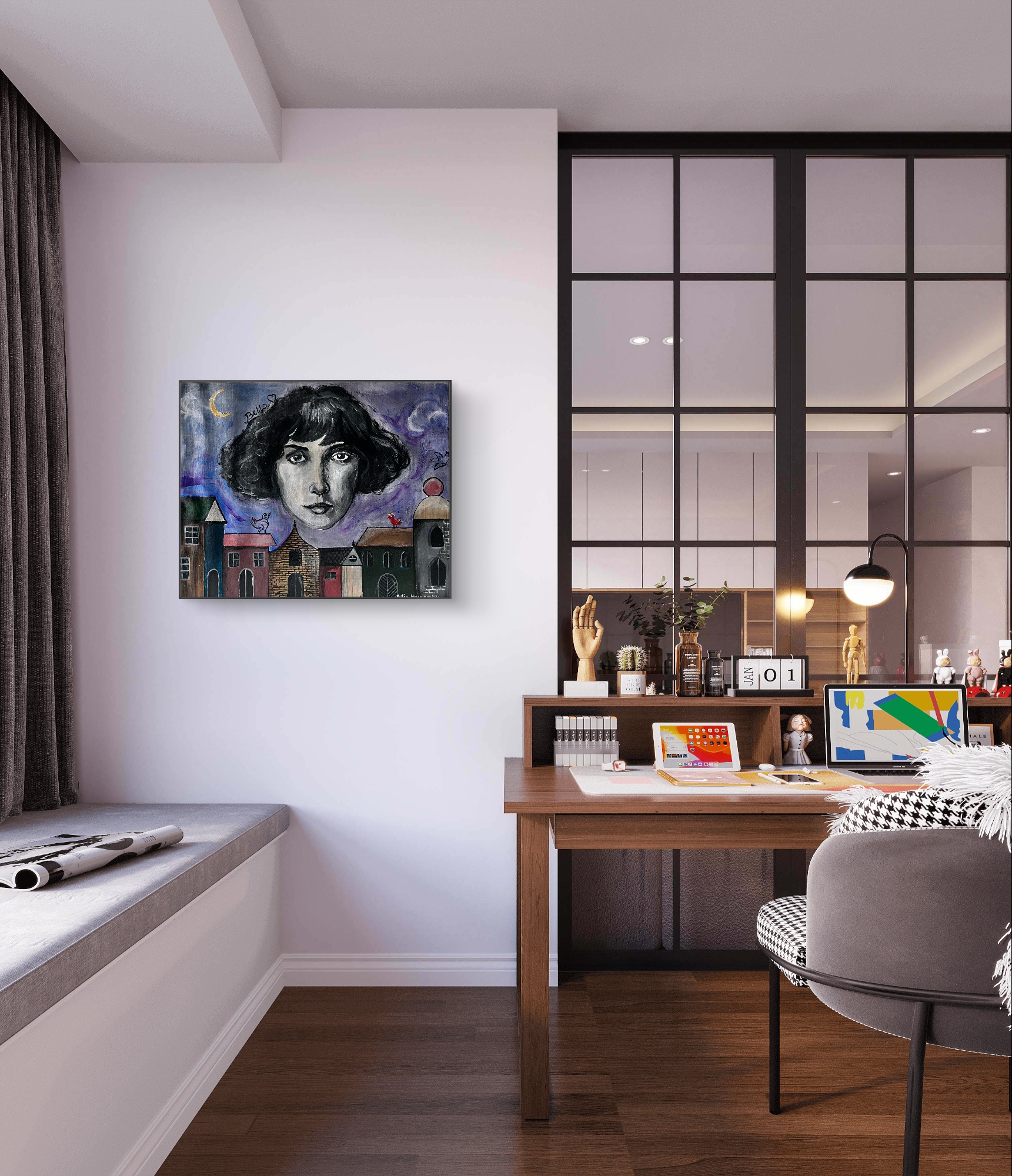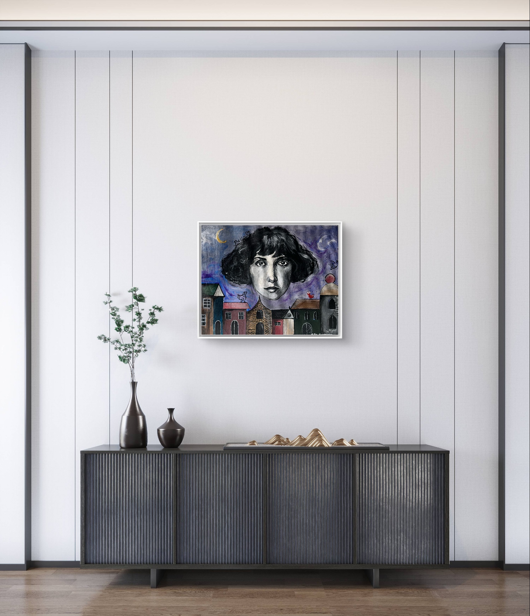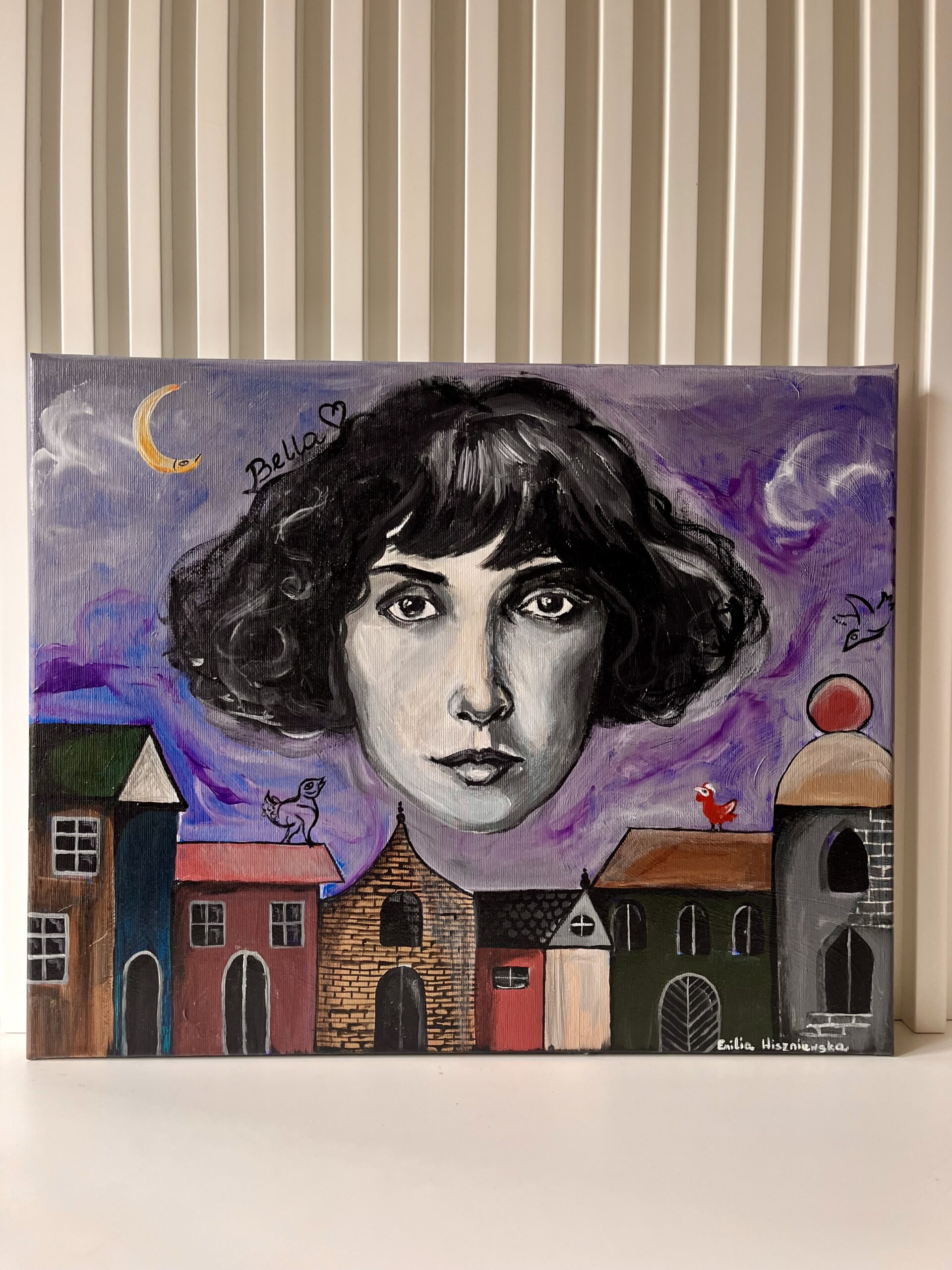 Obraz inspirowany malarstwem Marca Chagalla, pełen poetyckiej magii i sennego nastroju. W fioletowym niebie unosi się twarz kobiety, a poniżej rozciąga się kolorowe miasteczko.