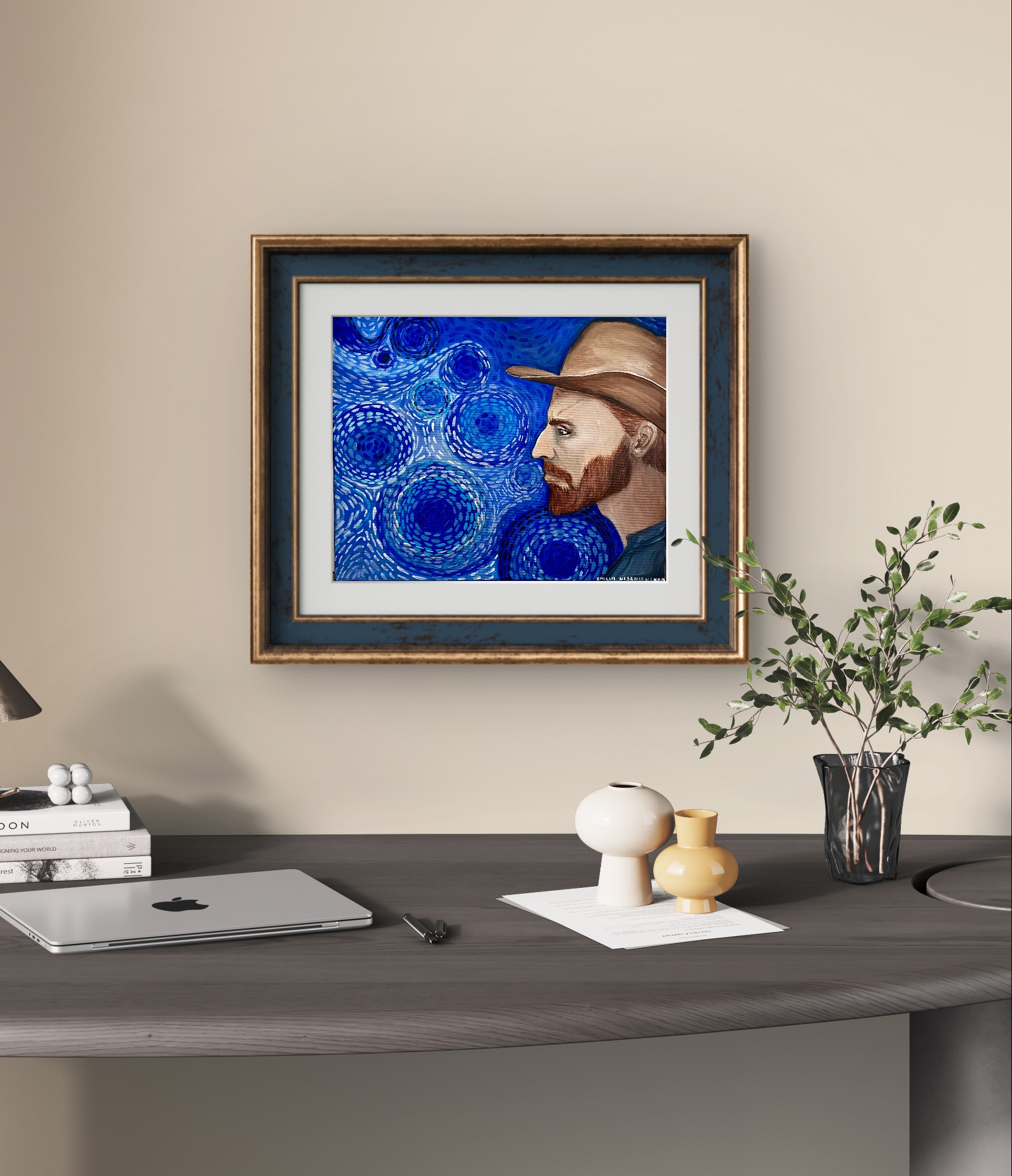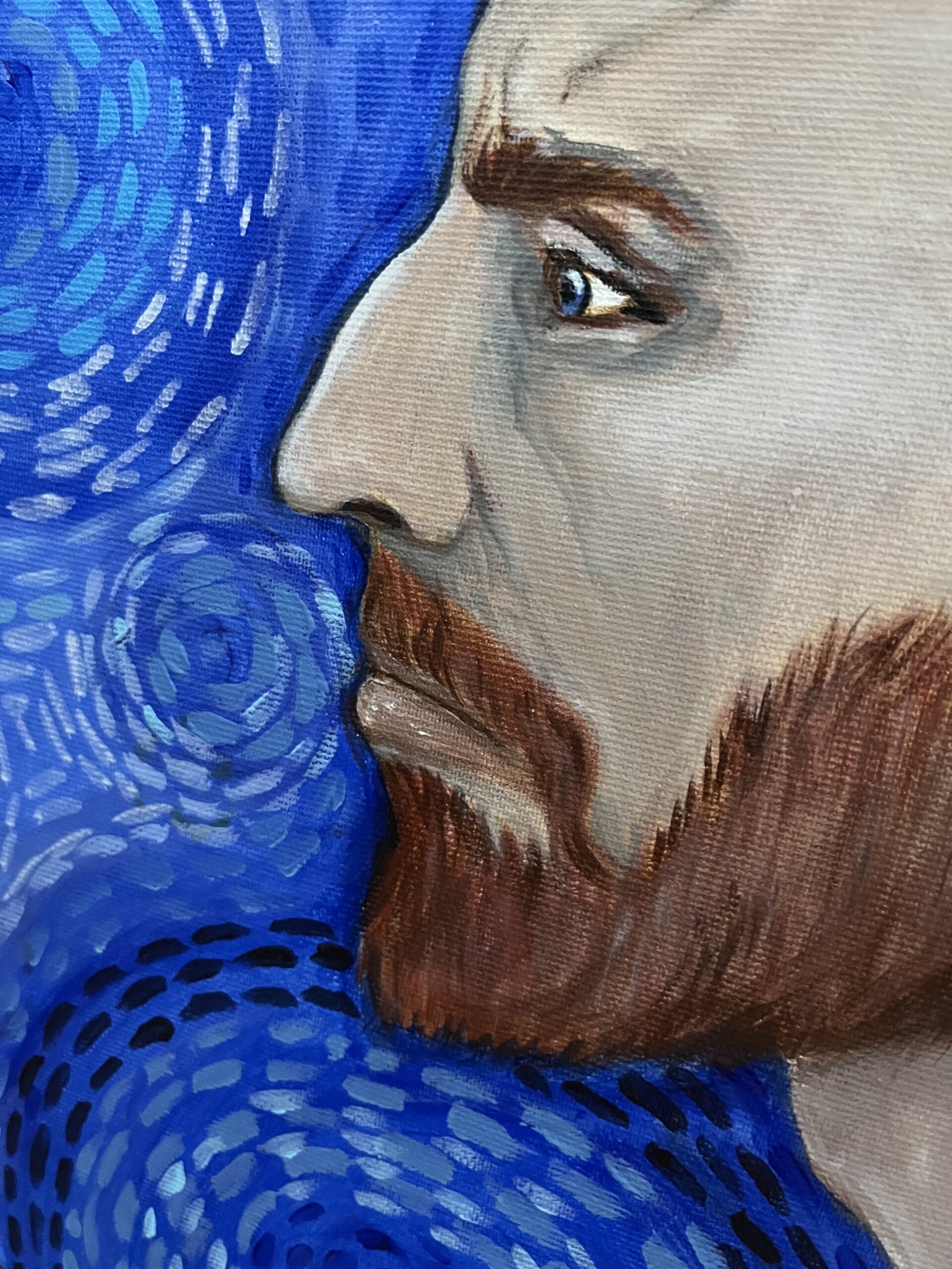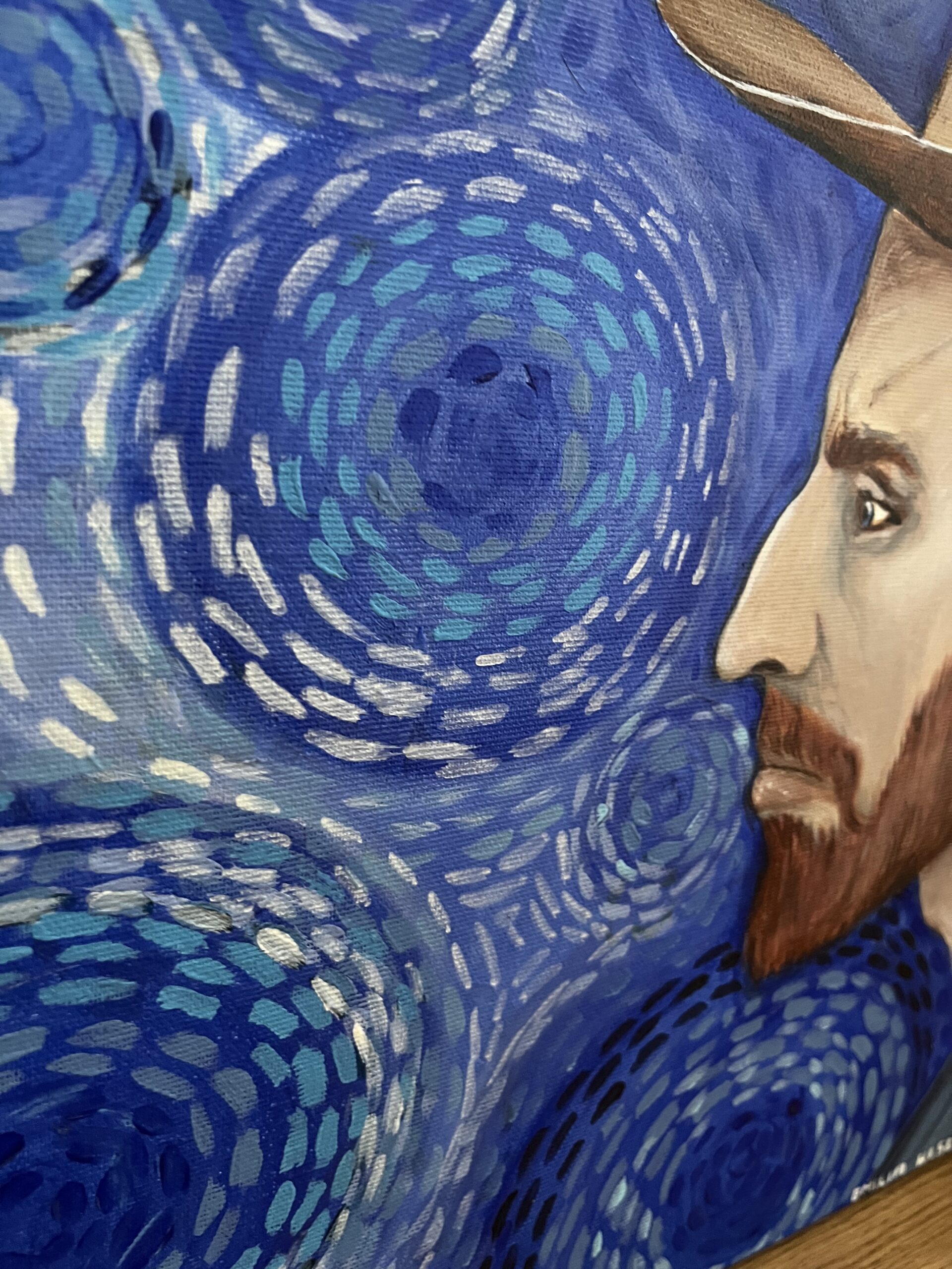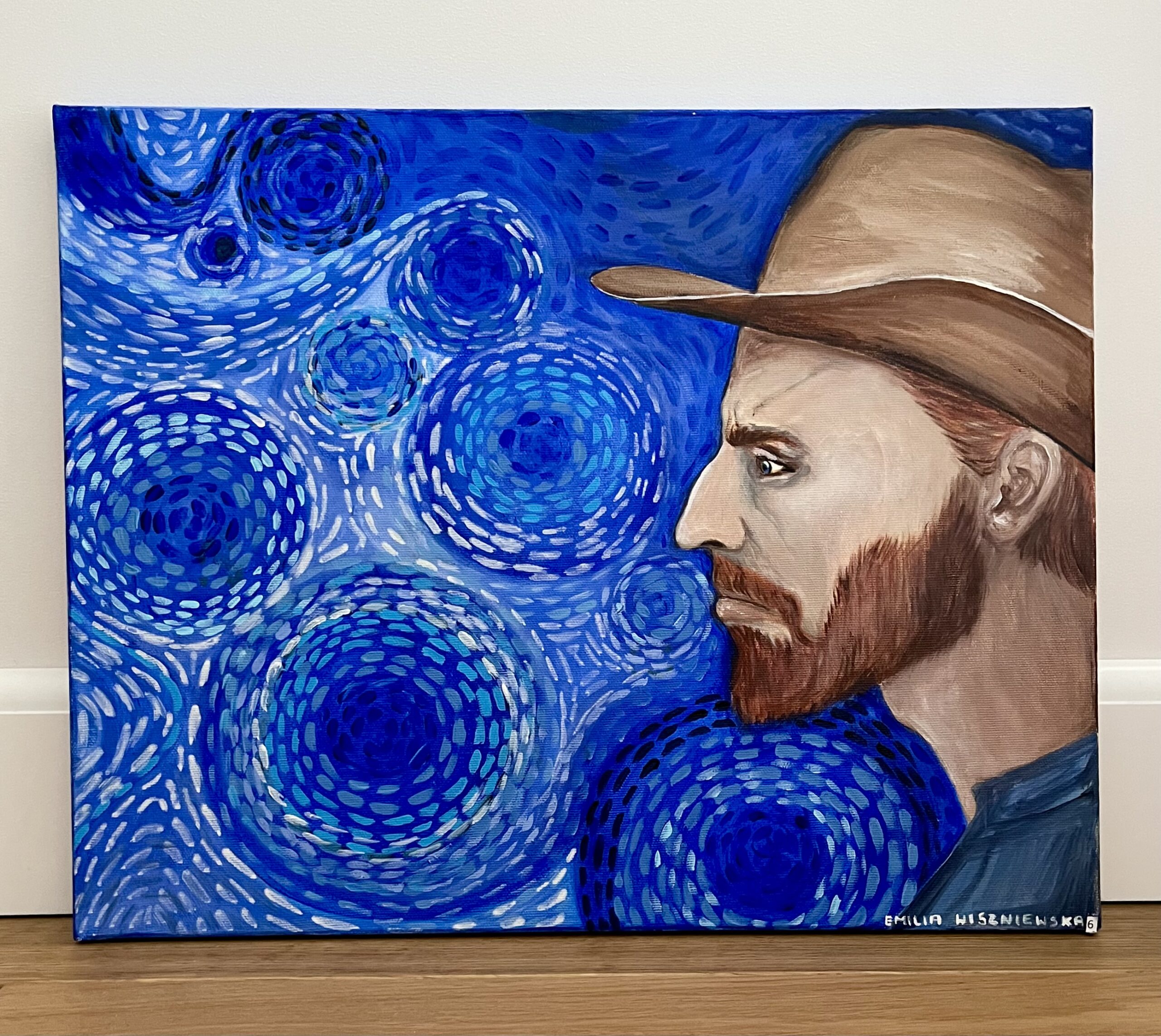 Obraz inspirowany duchem Vincenta van Gogh. Ukazuje spojrzenie ku wirującemu niebu jako symbol tęsknoty za nieskończonością