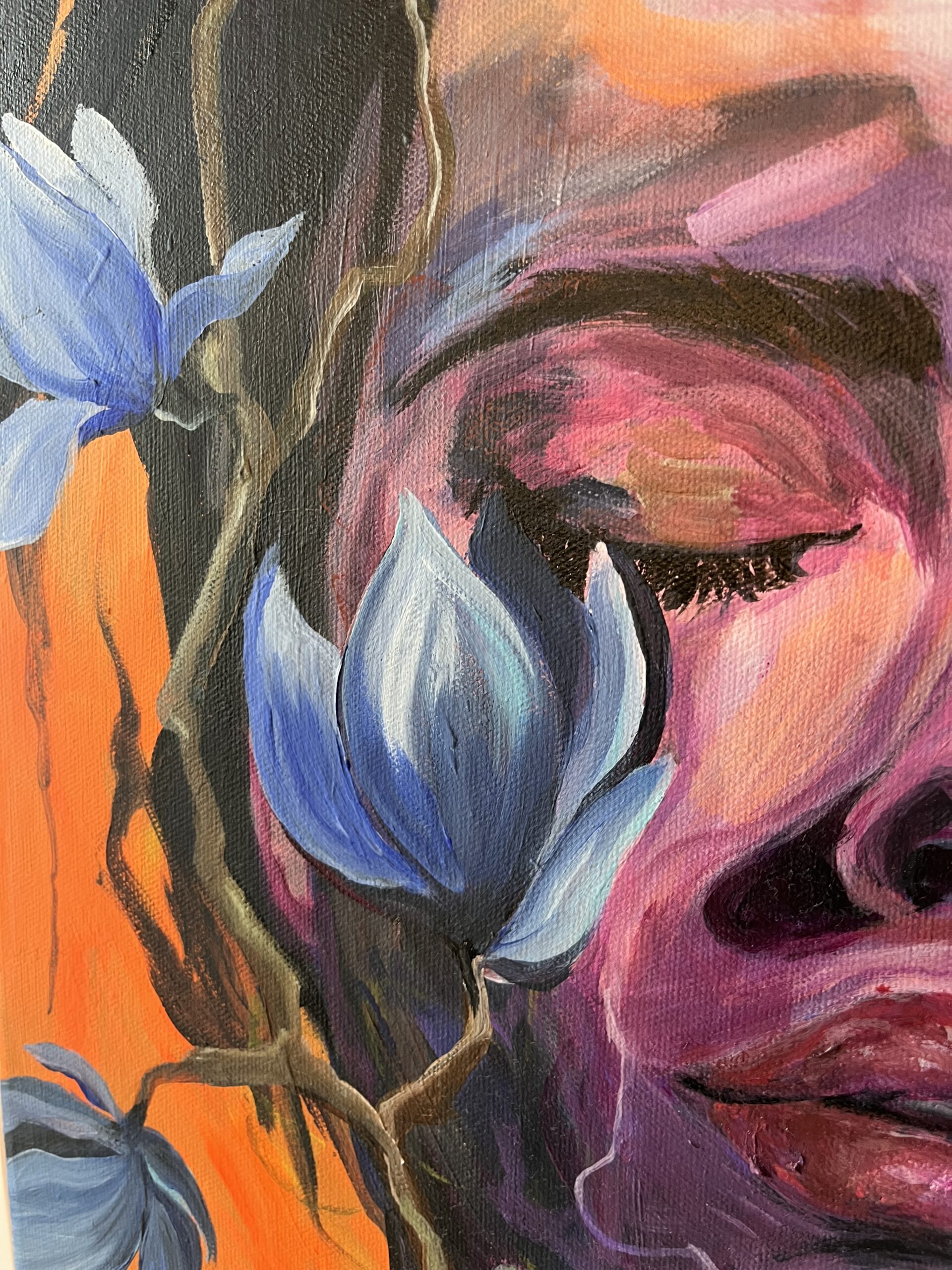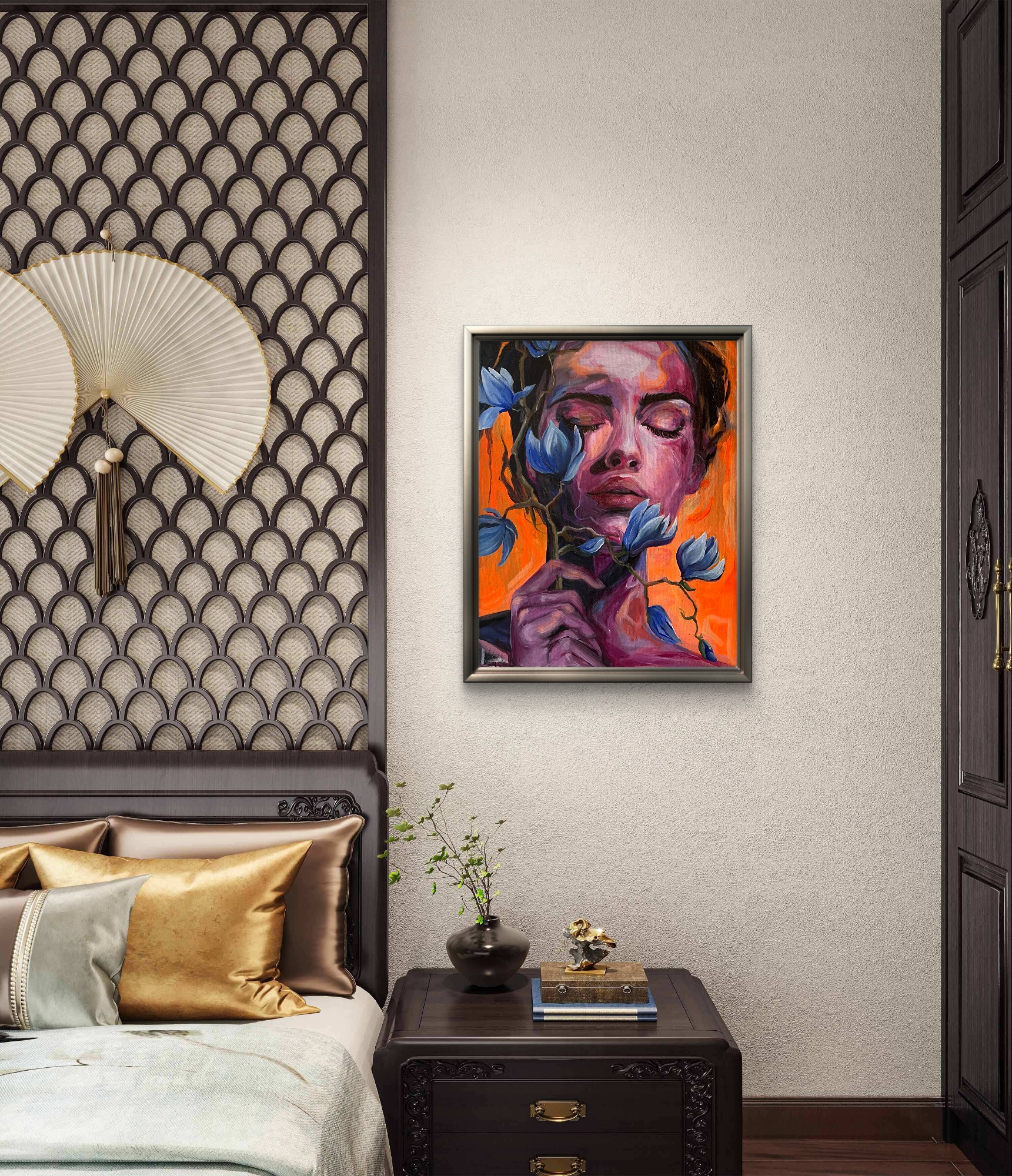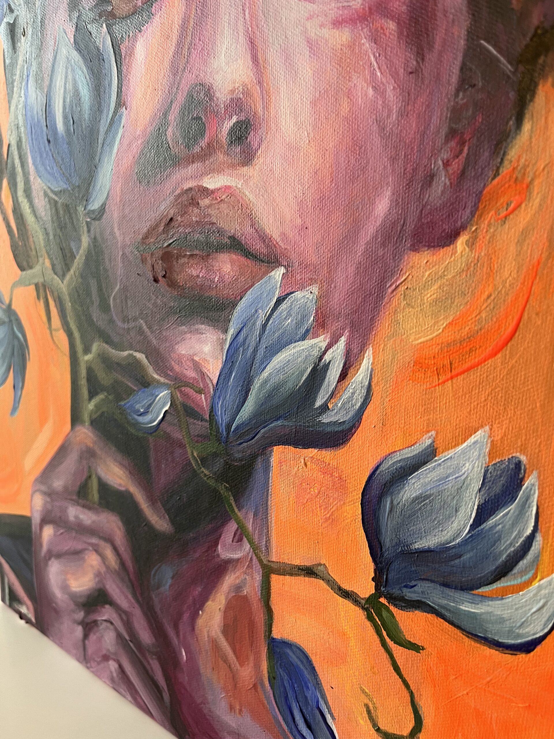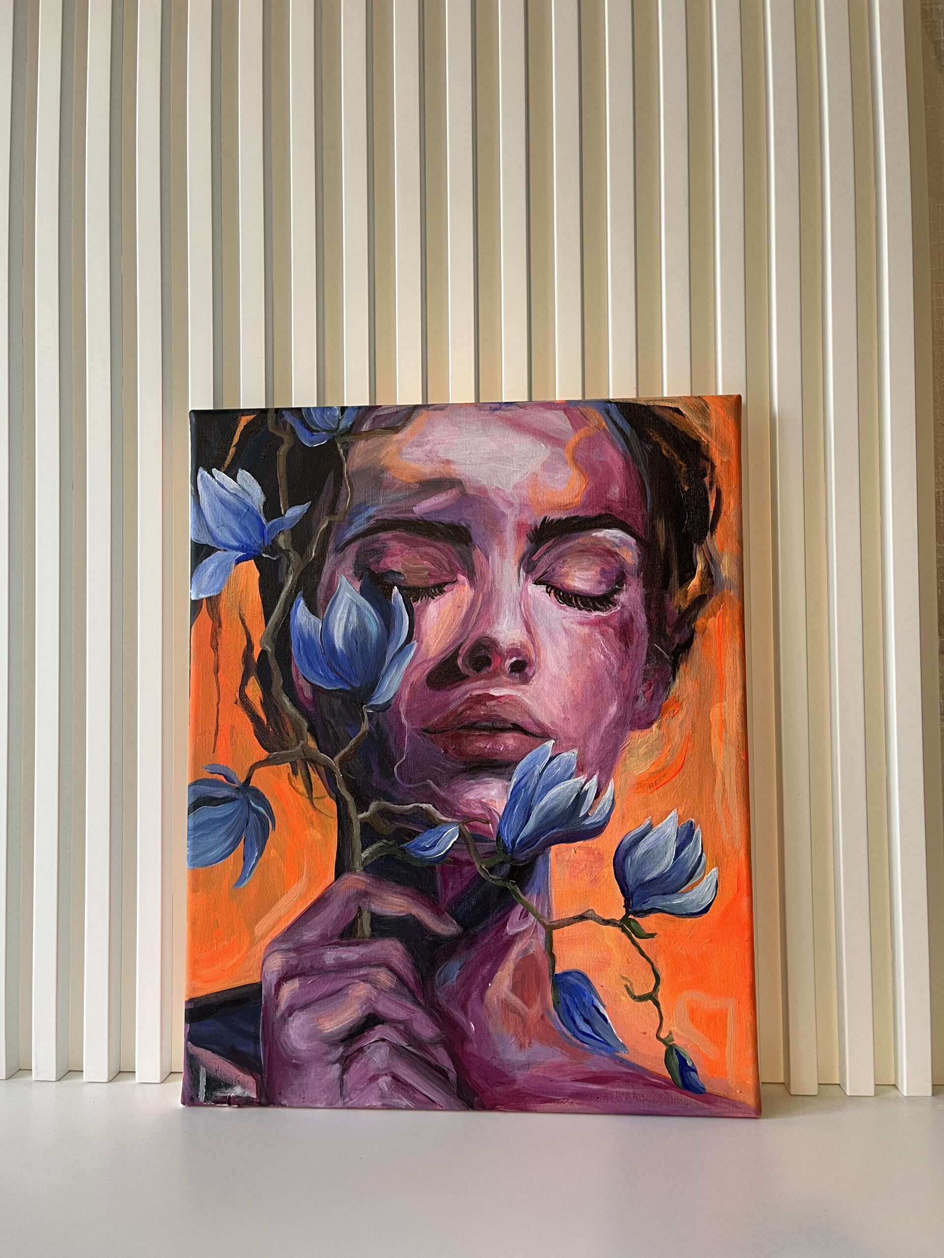 Kobieta z zamkniętymi oczami zdaje się wsłuchiwać w zapach błękitnych kwiatów otaczających jej twarz. Ciepłe, pomarańczowe tło podkreśla spokój i skupienie chwili.