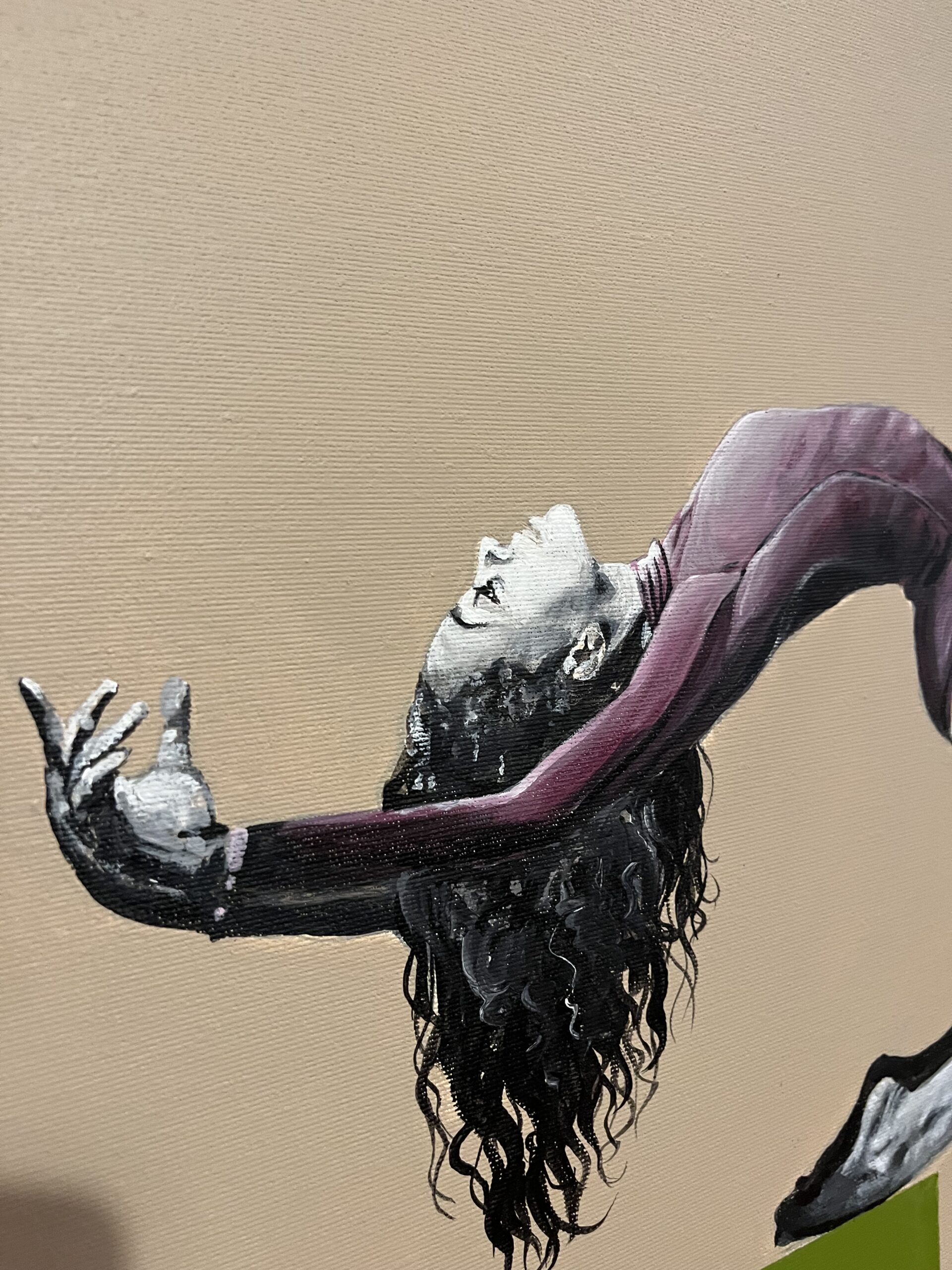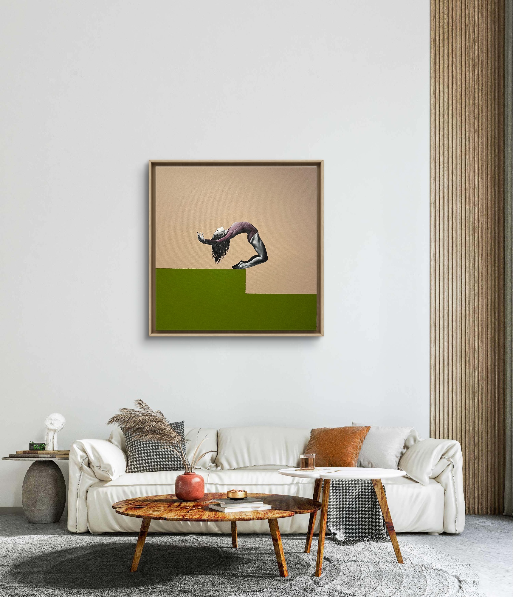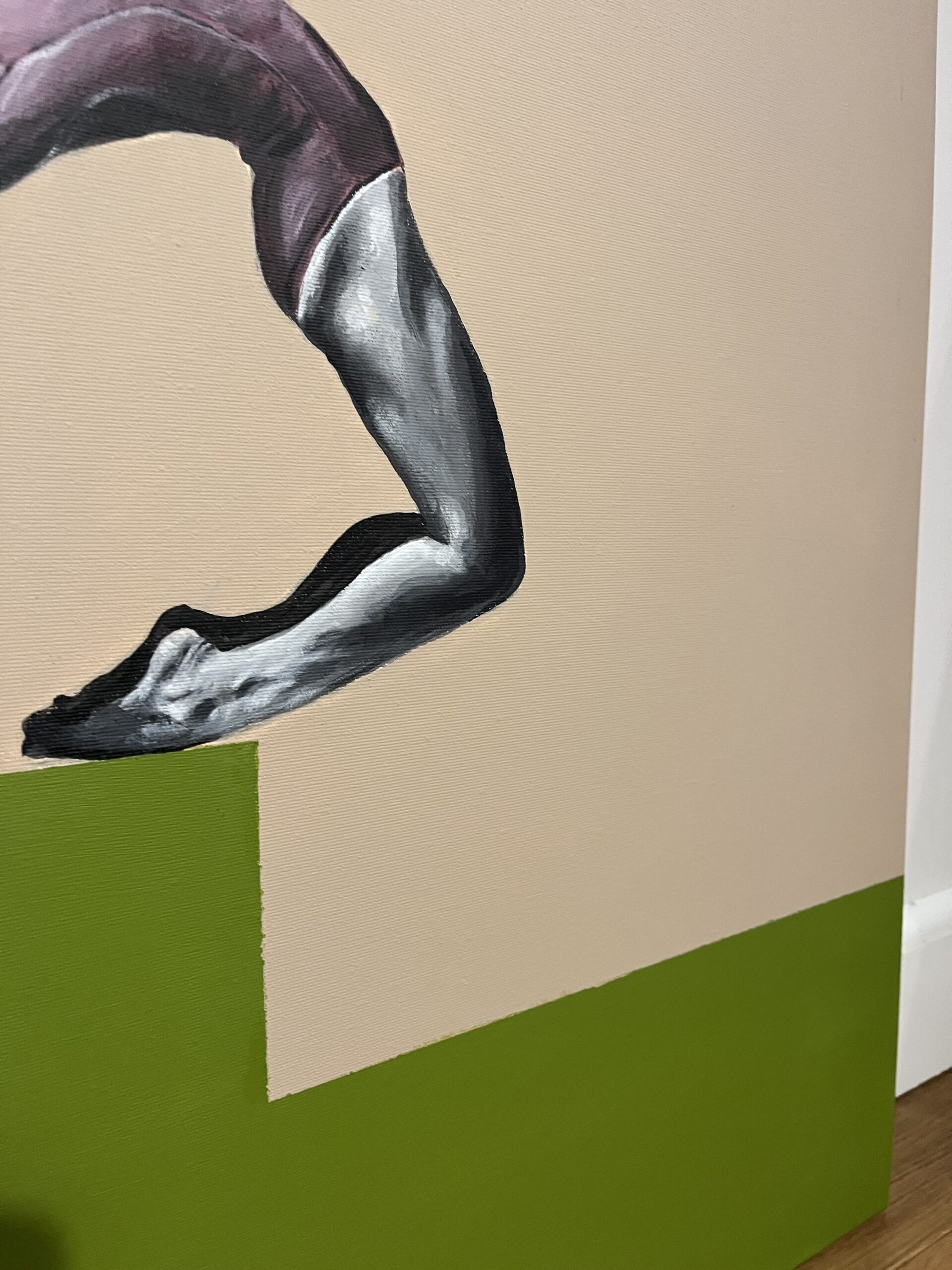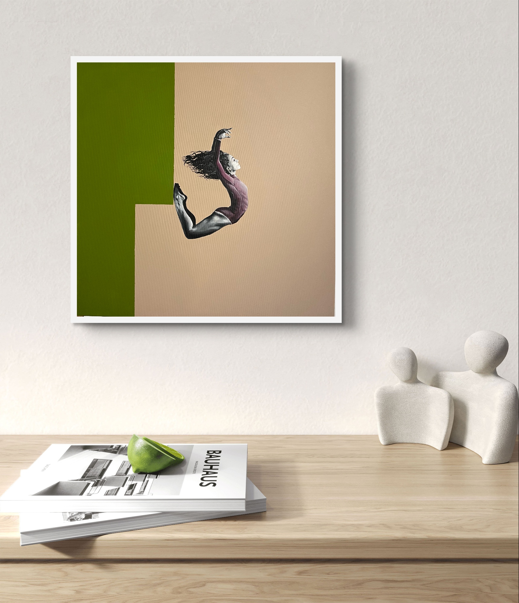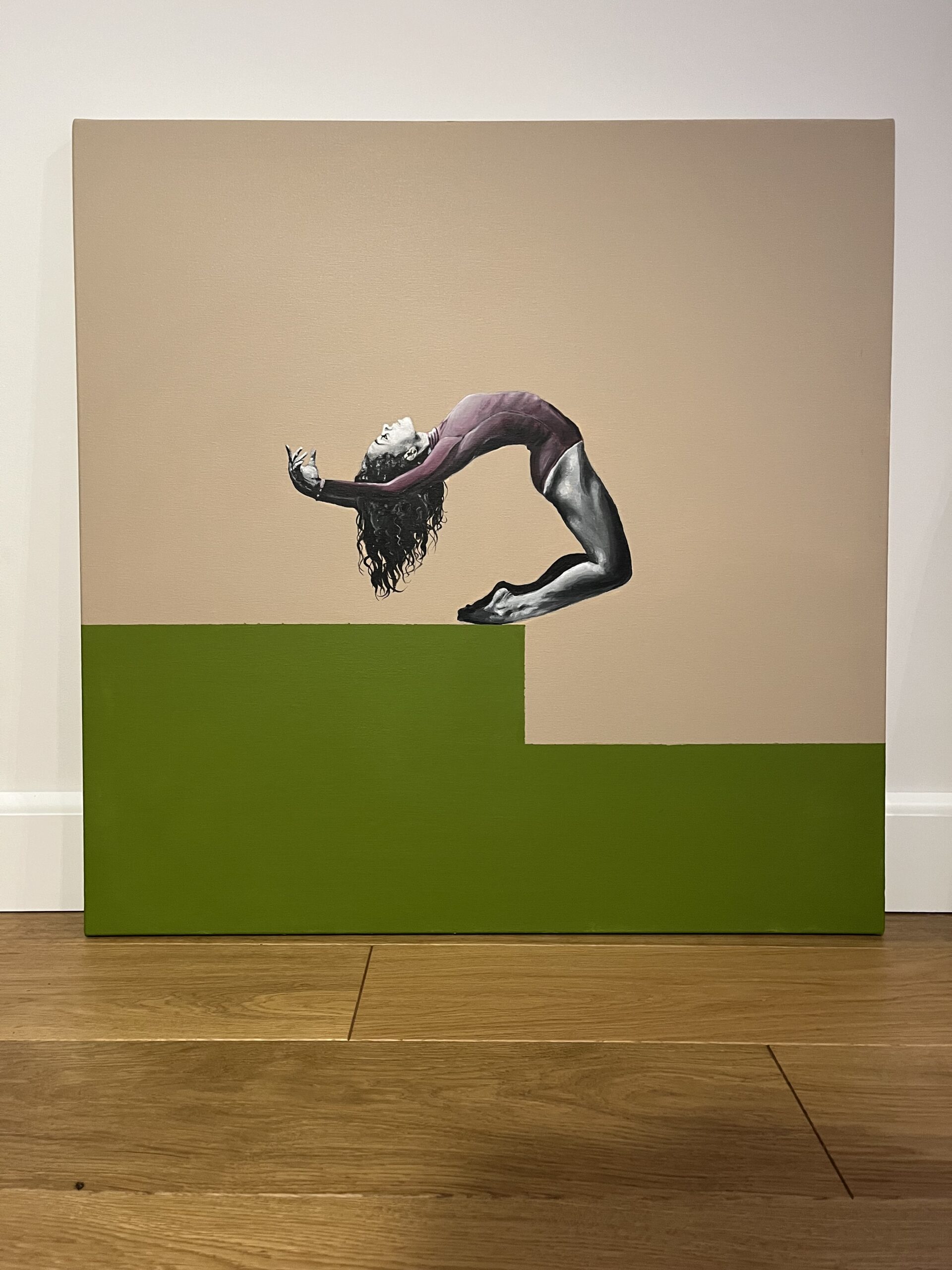 Postać tancerki wygiętej w pełnym napięciu łuku zdaje się unosić pomiędzy dwiema płaszczyznami koloru. Minimalistyczne tło podkreśla siłę ruchu i wyraża moment zawieszenia pomiędzy wysiłkiem a lekkością.